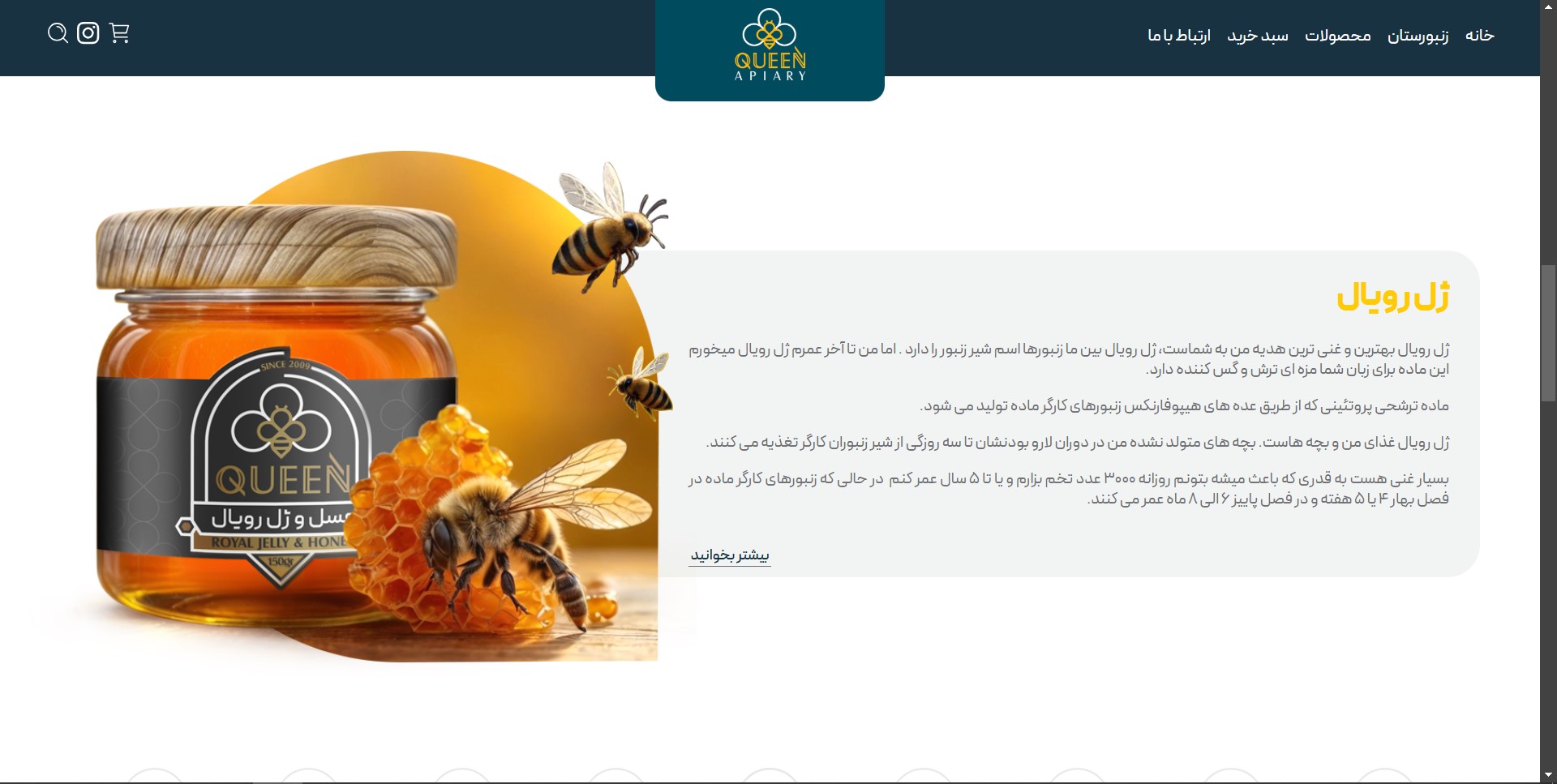 وبسایت فروشگاهی زنبورستان ملکه به سفارش این مجموعه و با هدف فروش عسل طبیعی طراحی شده است. این وبسایت با دارا بودن طراحی UI اختصاصی، کاملاً ریسپانسیو و قابل اجرا بر روی تمامی دستگاهها، از ظاهری مدرن و شیک برخوردار است. طراحی این سایت بر اساس هویت بصری برند انجام شده و ویژگیهایی نظیر جستجوی پیشرفته محصولات و فیلترهای حرفهای برای دستهبندی و انتخاب محصولات را شامل میشود.
